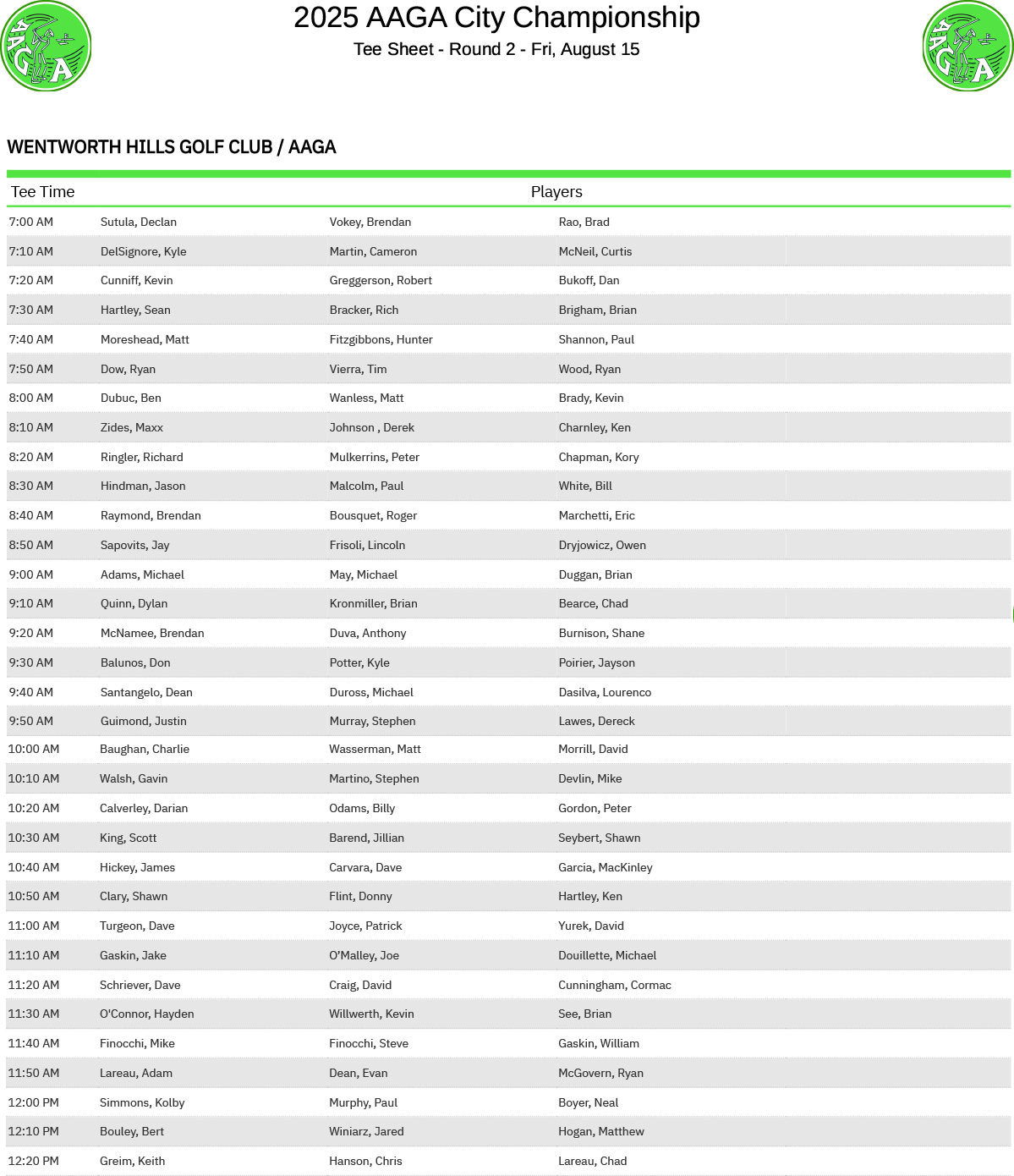 2025 AAGA City Open Round 2 Tee Times and Pairings