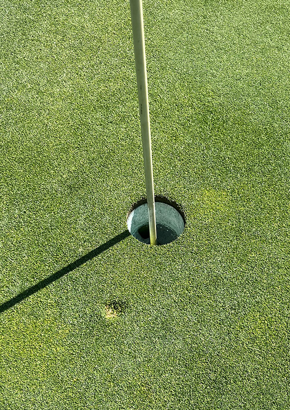 Jake Gaskin had a hole-in-one today on the 143 yard, par-3, 10th hole. He hit a "soft" wedge that nearly swished. The shot hit then spun back into the hole. Note how close the ball mark is to the hole.
